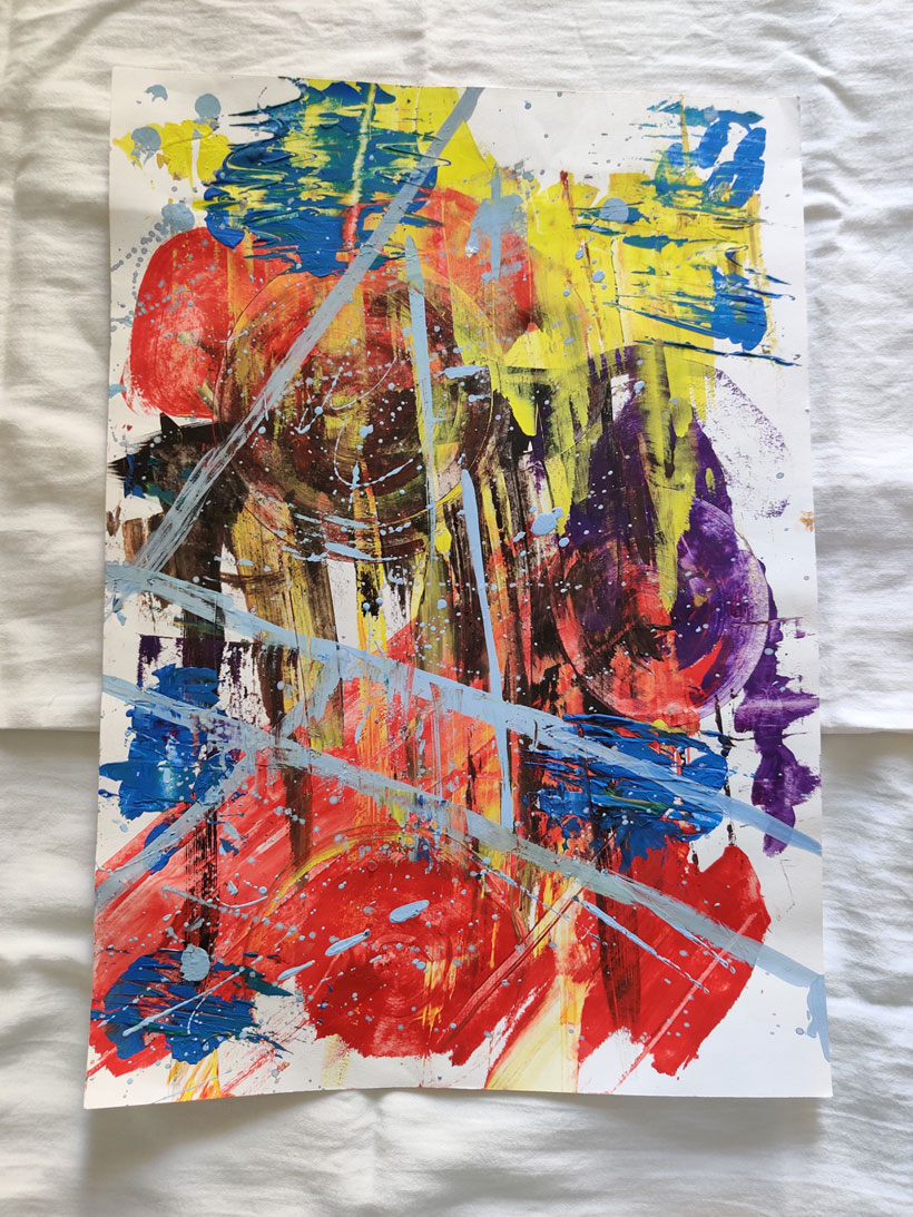 This abstract work was made using a slab of glass (for the circular spirals) and one single brush. Splash effect and overlapping of colours has also been used.