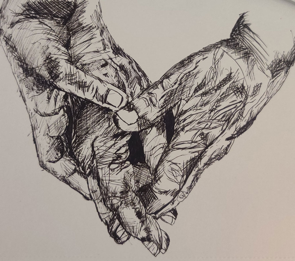 The word ‘comfort’ seems to be the essence of solace. Your first cup of steaming coffee in the morning, the voice of rain crashing against your roof, the crisp smell of eucalyptus oil, in my case. This word, which holds unique to so many-I look at my grandfather plucking jackfruit pods with great enthusiasm. It’s the little things that bring him joy. This sketch may be a simple black and white sketch with three hands, yet it aims to portray a range of emotions. The two hands on the extreme right are his, whereas the one hand on the extreme left and smaller in size is mine. Our hands briefly provide each other with comfort, reassurance and Solace. Time waits for no one, the only place where it can freeze, or even stop for a brief moment, are your memories. I chose my grandfather as a subject for this sketch to face the harsh reality of time, as well as preserve and protect this special moment, as a memory.